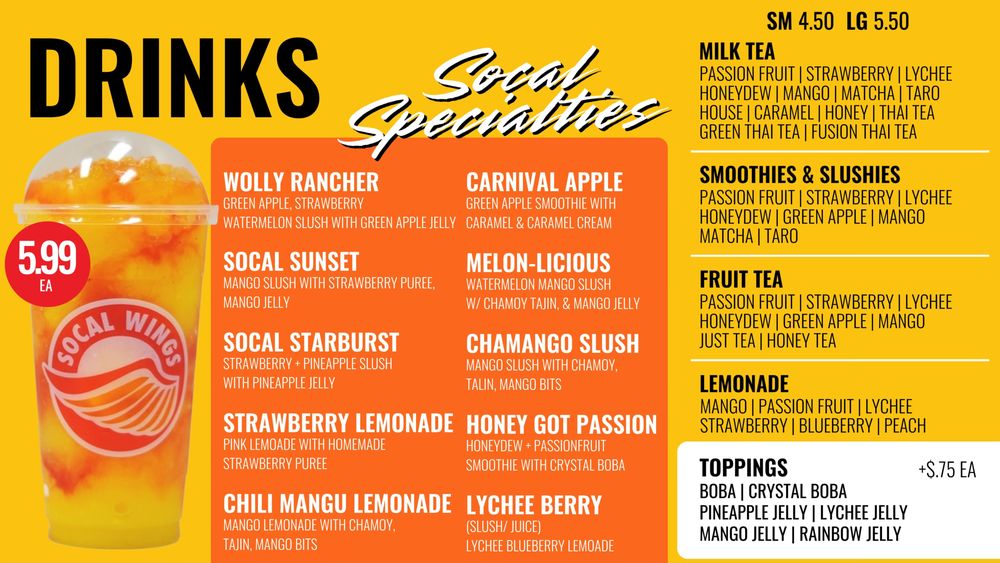 SoCal Wings in Westminster, CA offers a wide range of wing meals, mains, and rice dishes. With options like the SoCal Fries, Battered Shrimp, and Fried Rice, there is something for everyone to enjoy. Customers rave about the flavorful wings, with options ranging from traditional to spicy flavors like honey sriracha. The friendly staff and quick service make dining at SoCal Wings a pleasant experience. The relaxed atmosphere and varied drink menu add to the overall enjoyment of the visit. With delicious food, great service, and a welcoming environment, SoCal Wings is a must-visit spot for chicken wing lovers in the area.